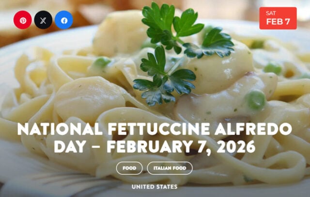 February 7 is National Fettuccine Alfredo Day. You don’t get the status as one of the most popular pasta dishes created without good reason. Fettuccine Alfredo is an Italian (obviously) pasta dish consisting of fresh fettuccine tossed with butter and Parmesan cheese. It’s simple yet delicious. It’s so tasty that it deserves a day all to itself. Whether you are dining out or doing a spot of home cooking, make sure that Fettuccine Alfredo is on the menu on February 7.
