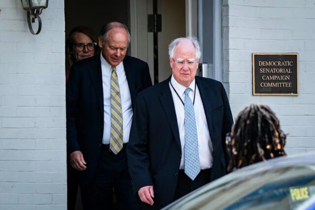 From right to left, the Biden advisers Mike Donilon, Steve Ricchetti and Jen O’Malley Dillon leaving a meeting with Senate Democrats in Washington earlier this month. (Credit...Haiyun Jiang for The New York Times)