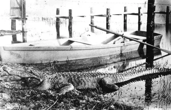 The picture taken in the Everglades circa 1900 shows the mammoth size of alligators and their agility.