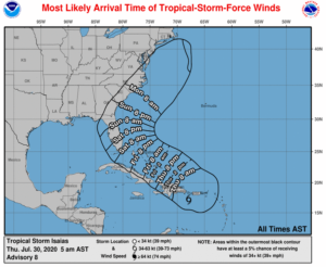 We’ll watch closely for the effects of the high mountains of Hispaniola on Isaias on Thursday. That should weaken the system significantly, but the large circulation of Isaias could lead to a new center forming to the north, which could allow for quicker restrengthening. A new center could also affect the future track of Isaias, so what happens on Thursday will be a major factor in determining our weather this weekend.