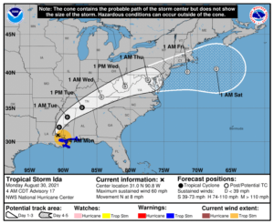 Ida is now a tropical storm, but not before bringing devastating winds and storm surge to coastal Louisiana as it made landfall on Sunday.  At 5 am Monday, Tropical Storm Ida was located near 30.0 North, 90.8 West, about 95 miles south-southwest of Jackson, Mississippi.  Maximum sustained winds were 60 miles per hour, and Ida was moving north at 8 miles per hour.  Ida continues to bring flooding rain as it moves inland, and the Louisiana and Mississippi coasts were still feeling the effects of storm surge early on Monday.