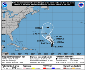 Tropical Depression # 10 is struggling against upper level winds.  At 5 am, TD # 10 was located near 20.8 North, 50.6 West, about 775 miles east-northeast of the Leeward Islands.  Maximum sustained winds were 35 miles per hour, and the depression was moving north at 8 miles per hour.  TD # 10 still could reach tropical storm strength, but it’s expected to remain over open waters.