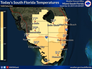 South Florida will be cooler on Saturday after last night’s storms and showers. The day starts with lingering showers in spots, followed by good sun and a few clouds. A high risk of dangerous rip currents is in place at the Gulf beaches, and some minor flooding is possible along the Gulf coast. Highs on Saturday will be near 80 degrees.