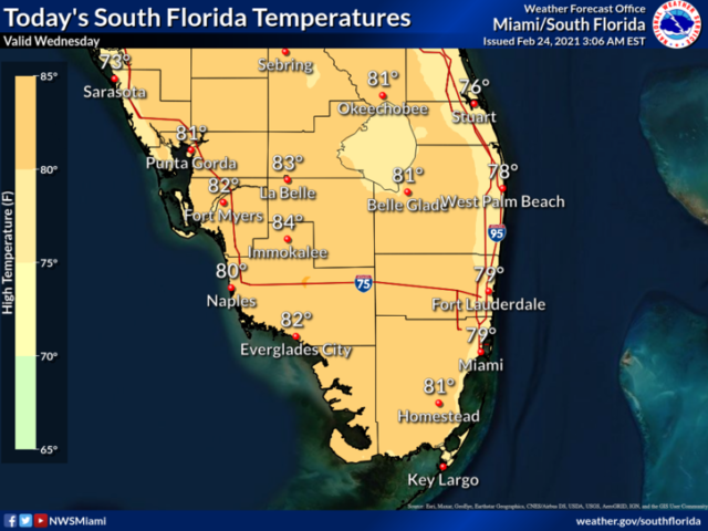 Sunday’s forecast calls for lots of sun around South Florida and breezy conditions in the east coast metro area. Highs on Sunday will be in the mid-80s.