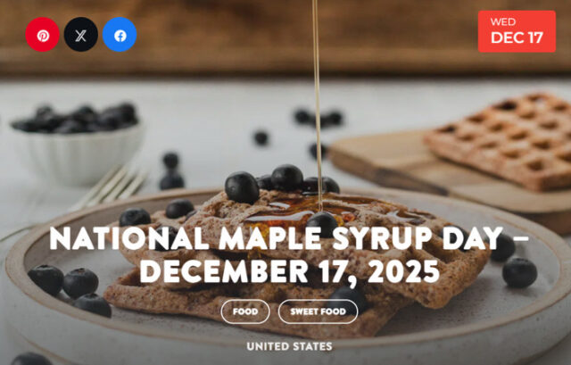 National Maple Syrup Day is on December 17! This viscous yet delicious condiment is just as versatile as it is tasty; people enjoy it drizzled over everything: from pancakes to eggs, to salads, to barbecue, this sugary substance has more potential than some give it credit for. On December 17, pour away!