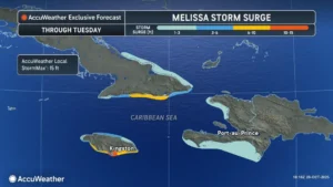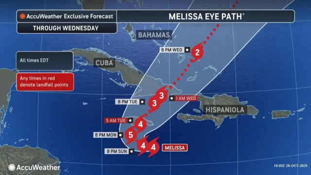 “Melissa exploded in intensity over the warm waters of the Caribbean. These waters have not been churned up by any other tropical storms or hurricanes this year. The warmest waters in the entire Atlantic basin have provided an abundance of energy for this hurricane to strengthen and unleash tremendous amounts of rain and powerful winds. Melissa could be the third storm of the season to reach Category 5 strength.”