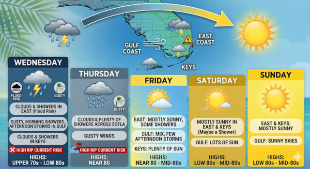 Wednesday features clouds and showers across the East Coast, with additional rainfall expected to lead to more flooding — so the flood watch for urban areas of Miami-Dade, Broward, and Palm Beach counties has been extended through at least 10 pm Wednesday evening.  The Gulf Coast will see a gusty breeze and a mix of sun, clouds, morning showers, and afternoon and evening storms.  Look for clouds and showers in the Keys.  A high risk of dangerous rip currents is in place at the Atlantic beaches through Thursday evening.  Wednesday’s highs will be in the upper 70s right at the Atlantic coast and in the low 80s elsewhere in South Florida.