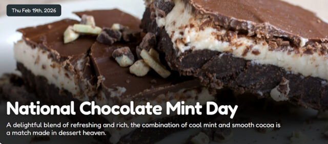 Recognized by the US National Confectioners Association, National Chocolate Mint Day is observed annually across the nation on February 19th. This holiday has been set aside for all the chocolate mint lovers to eat their favorite treats all day long.