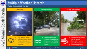 Saturday will feature periods of showers and storms with sun and clouds at times in the east coast metro area, while the Gulf coast will see good sun in the morning and showers and storms in the mid to late afternoon. Saturday’s highs will be in the upper 80s.