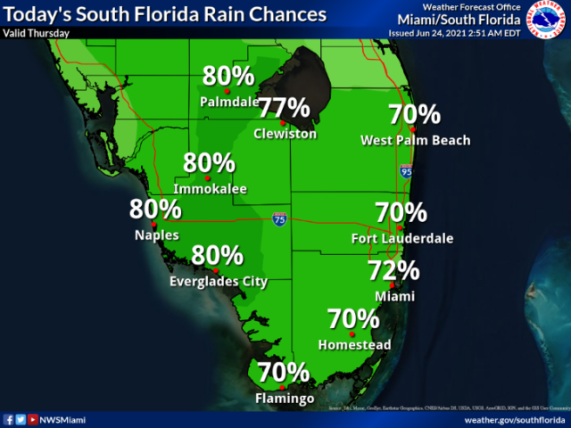 Monday’s forecast calls for widespread showers and storms with periods of sun and clouds. Highs on Monday will be near 90 degrees in the east coast metro area and in the upper 80s along the Gulf coast.