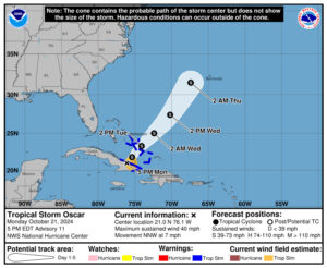 In the tropics, Tropical Storm Oscar continued to bring very heavy rain as it lingered over eastern Cuba on Monday. At 5 pm Monday, Oscar had maximum sustained winds of 40 miles per hour and was moving north-northwest at 7 miles per hour. A tropical storm warning is now in effect for the central Bahamas as well as the southeastern Bahamas. A turn to the northeast is forecast, and Oscar is likely to pass near Bermuda before being absorbed by an area of low pressure on Thursday.