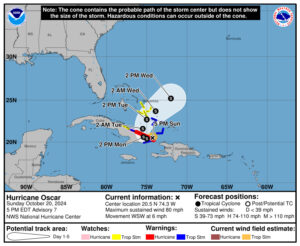 In the tropics, Hurricane Oscar was approaching landfall in northeastern Cuba Sunday evening. At that time, Oscar’s maximum sustained winds were 80 miles per hour, and the hurricane was moving west-southwest at 6 miles per hour. Oscar is forecast to weaken to a tropical storm and then turn to the northeast on Monday. There is a tropical storm warning for both the central and southeastern Bahamas. No watches or warnings are expected for either South Florida or the northwestern Bahamas.
