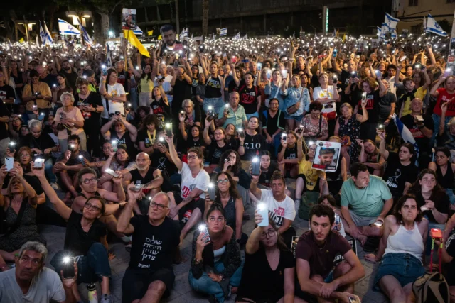 Protesters calling for an end to the war in Gaza raise the flashlights on their mobile phones during a rally in Tel Aviv on Saturday. (Credit...David Guttenfelder/The New York Times)