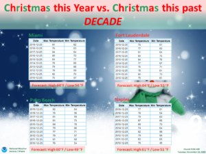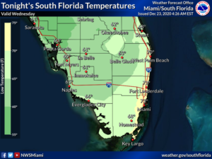 Wednesday features plenty of nice December sun, a few clouds, and a sometimes gusty ocean breeze.  A high risk of dangerous rip currents is in place along the Palm Beach County coast, and there’s a moderate rip current risk at the beaches in Miami-Dade and Broward.  Highs on Wednesday will be in the seasonable upper 70s.