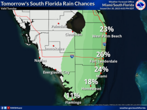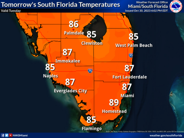The Halloween forecast features mostly sunny skies around South Florida with maybe an afternoon storm in spots in the East Coast metro area. Trick-or-treaters could encounter a stray East Coast shower. Look for a moderate risk of dangerous rip currents at the Atlantic beaches and minor flooding at high tide along the Atlantic coast. Highs on Tuesday will be in the 80s right at the coasts and in the Keys, with the rest of South Florida topping out in the upper 80s.