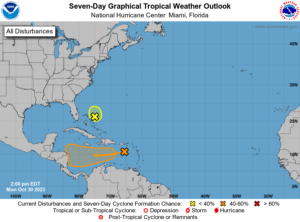 In the tropics, the area of disturbed weather east of the northwestern Bahamas is battling wind shear and dry air. It has a low chance of becoming a depression. Elsewhere, we’re keeping an eye on a trough of low pressure in the eastern Caribbean. This feature has a medium chance of developing during the next several days as it moves westward toward the coast of Central America.
