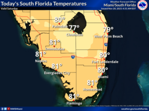 Sunday will be mostly sunny with some showers at times on an ocean breeze. Sunday’s highs will be in the low 80s in the east coast metro area and the upper 70s along the Gulf coast.