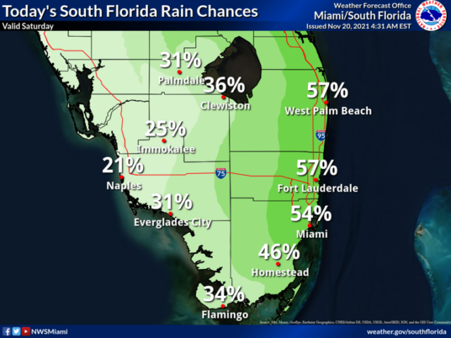 Saturday features lots of showers on a brisk and gusty breeze. Showers are likely in the east coast metro area, and some locations near the Gulf coast will see them as well. Localized flooding is possible in portions of the east coast metro area that are already saturated from several days of heavy rain. A high risk of dangerous rip currents remains at the Atlantic beaches. Highs on Saturday will be in the low 80s.