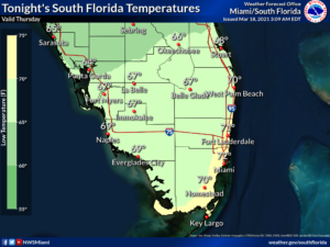 Sunday will be sunny along the Gulf coast, while the east coast metro area will be mostly sunny skies and a few showers at times. Sunday’s highs will be in the upper 70s.