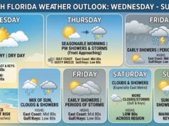 Wednesday’s forecast calls for another cool morning and more clouds than sun. Look for periods of showers in the Keys. Highs on Wednesday will be mainly in the upper-70s in the East Coast metro area and in the mid-70s along the Gulf Coast and the Keys.