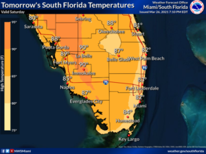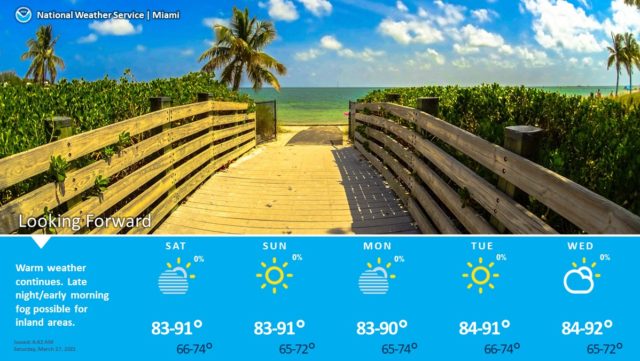 Sunday will start with some patchy fog around much of South Florida.  Then the day will bring mostly sunny skies and a brisk and sometimes gusty breeze.  Sunday’s highs will be in the mid to upper 80s in the east coast metro area and the mid-80s along the Gulf coast.