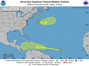 The tropical Atlantic is heating up again. We’re watching a wave in the central Atlantic that will be bringing heavy rain and gusty winds to the Windward Islands in a couple of days. This wave currently has a low chance of development once it reaches the Caribbean — but we’ll keep a close eye on it, since the Caribbean is the key area for tropical development in October. And there’s a low well east of the northeast U.S. coast that has some chance of becoming a subtropical storm in the next few days.