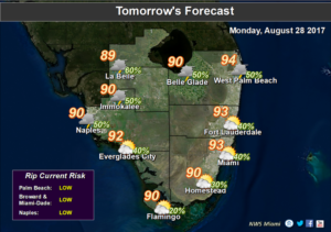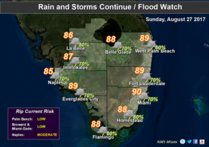 Rain lingers in South Florida on Sunday, and the flood watch for our area has been extended through the evening. Sunday features a bit of sun at times, more clouds, and periods of showers and storms in the afternoon, including flooding downpours in spots. Highs on Sunday will be near 90 degrees.