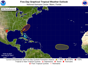 Tropical Storm Harvey continues to drop monumental amounts of rain on parts of Texas, including the Houston area. At 5 am Sunday, Harvey was located near 29.2 North, 97.7 West, and was crawling to the south-southwest at 1 mile an hour. Maximum sustained winds were 45 miles per hour, but the story continues to be the 2 or more feet of rain possible during the next few days. Harvey is on track to be one of the costliest disasters in U.S. history.