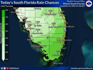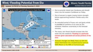 We’ll watch Eta very carefully during the next several days. At this time, South Florida is in the 4-to-5-day “cone,” and it makes sense to top off your hurricane kit if necessary. Eta is forecast to make its closest approach to us on Monday into Tuesday, and at time computer models indicate it will be a strong tropical storm. This is a more complicated forecast than usual, so make sure to keep track of Eta and be ready to act if necessary.