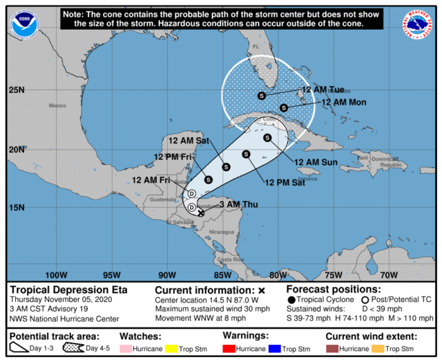 In the tropics, Eta is now a tropical depression, but it continues to bring heavy rain and dangerous flash flooding to portions of Central America. At 4 am Thursday, Eta was located near 14.5 North, 87.0 West, and was moving west-northwest at 8 miles per hour. Maximum sustained winds were 30 miles per hour. Eta is forecast to reenter the Caribbean overnight and restrengthen to a tropical storm as it moves in the direction of western Cuba.