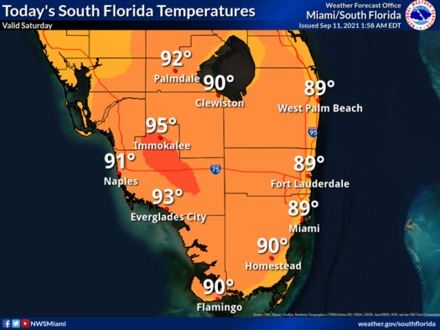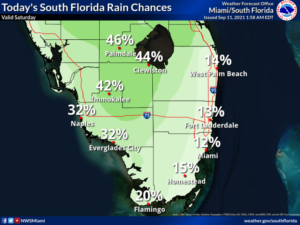 Saturday features mostly sunny skies throughout most of the day. A few showers and a storm or two will develop in the afternoon. A moderate risk of dangerous rip currents remains along the Palm Beach County coast. Highs on Saturday will be near 90 degrees in the east coast metro area and in the low 90s along the Gulf coast.