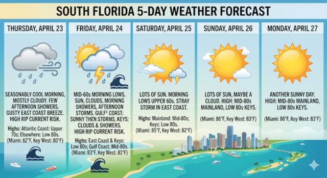 Thursday features a seasonably cool morning on the mainland, followed by more clouds than sun and a few afternoon showers, with a gusty East Coast breeze. The Gulf coast will see mostly sunny skies with some afternoon showers, and the Keys will see plenty of clouds with a few showers in spots. A high risk of dangerous rip currents remains at the Atlantic beaches into Friday. Thursday’s highs will be in the upper 70s right at the Atlantic coast and in the low 80s elsewhere in South Florida.