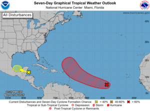 In the tropics, the wave that’s now entering the central Atlantic has a high chance of becoming a depression in a day or so.  It’s moving to the west-northwest and could affect the Lesser Antilles this weekend.  After that, its forecast track takes a decided turn to the northwest, keeping it well east of the Bahamas. Elsewhere, an area of low pressure is moving from the northwestern Caribbean into the Bay of Campeche.  While this feature has a low chance of developing, it will bring heavy rain and gusty winds to the Yucatan, southern Mexico, and Belize.