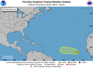 In the tropics, the wave in the eastern Atlantic has a low chance of developing during the next 5 days.