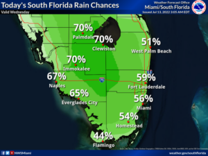 Sunday’s forecast calls for lots of clouds, sun at times, and periods of showers and storms. The east coast metro area will be breezy. Highs on Sunday will be mostly in the low 90s.