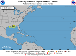 In the tropics, the area of low pressure in the extreme northern Gulf of Mexico is unlikely to develop into a depression because it’s so close to land. But expect it to bring heavy rain to the Florida panhandle westward into Louisiana.