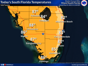 Tuesday features the return of showers and storms. The east coast metro area will see plenty of clouds along with those showers and storms, all on a gusty ocean breeze. The Gulf Coast will be sunny in the morning with showers and storms developing in the afternoon. A high risk of dangerous rip currents remains at the Atlantic beaches. Highs on Tuesday will be in the mid-80s in the east coast metro area and the upper 80s along the Gulf coast.