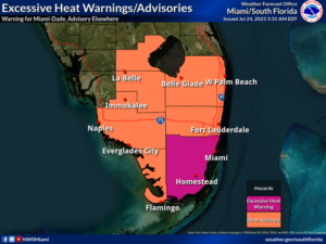 Monday features lots of very hot and hazy sun as our stretch of dangerously hot weather continues. An excessive heat warning is in effect for Miami-Dade from 10 am to 8 pm on Monday. The heat advisory continues for the rest of South Florida on Monday, and it’s been extended for all of South Florida until at least Tuesday evening. Highs on Monday will be in the mid-90s right at the coasts and in portions of the Keys, but elsewhere in South Florida, we’ll reach the upper 90s — and are expected to break some records. And it will feel at least 10 degrees hotter, so stay hydrated and out of the sun.