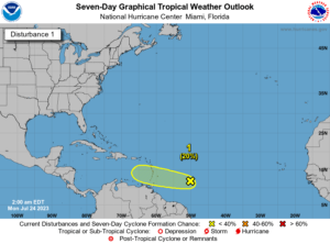 In the tropics, the wave in the central Atlantic now has only a low chance of becoming a depression before reaching portions of the Lesser Antilles later this week. After that, this wave will encounter hostile conditions in the Caribbean. Elsewhere, Don briefly became a hurricane on Saturday but has weakened to tropical storm strength again.. Since it’s moving into an area of cooler waters in the middle of the Atlantic, Don is forecast to lose its tropical characteristics on Monday and dissipate (finally) on Tuesday.