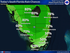 Tuesday will bring some sun, more clouds, and mainly afternoon and evening showers and storms. Tuesday’s highs will be mostly in the low 90s in the east coast metro area and in the mid-90s along the Gulf coast and in the Keys.