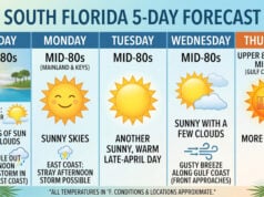 South Florida’s weather on Halloween is so nice that it’s scary. Wednesday features a mix of sun and clouds on the breeze during the day, and the evening will be dry and pleasant for ghouls, ghosts, and the rest of us. But beachgoers will need to watch out for dangerous rip currents along the Atlantic coast. Highs on Wednesday will be in the mid 80s — and trick-or-treating temperatures will be in the upper 70s in the early evening.A few overnight showers are in the forecast, and Thursday will bring sun, clouds, and a few showers in spots. Thursday’s highs will be in the upper 80s.