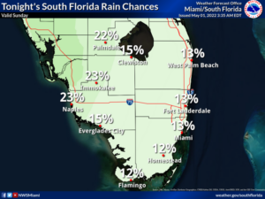 Monday will bring lots of sun and the chance of afternoon showers and a  few storms to the Gulf coast, as the east coast metro area will see a mix of sun, clouds, and passing showers on a strong breeze.  Monday’s highs will be mostly in the mid-80s in the east coast metro area and in the upper 80s along the Gulf coast.