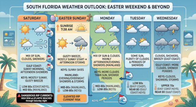 Sunrise on Easter Sunday will be at 7:38. Then look for a gusty breeze and mostly sunny skies, alternating with morning showers and afternoon storms, in the East Coast. The Gulf Coast will see lots of sun in the morning and periods of storms in the afternoon, while the Keys will see sunny skies. Look for showers and storms in the evening and overnight on the mainland. Expect an elevated risk of dangerous rip currents at the Atlantic beaches. Sunday’s highs will be mostly in the mid-80s on the mainland and in the low-80s in the Keys.