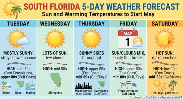 Saturday’s forecast calls for hot sun around South Florida. Highs on Saturday will be mostly in the low 90s in the East Coast and in the mid-80s along the Gulf Coast and in the Keys.