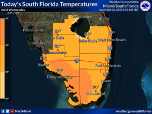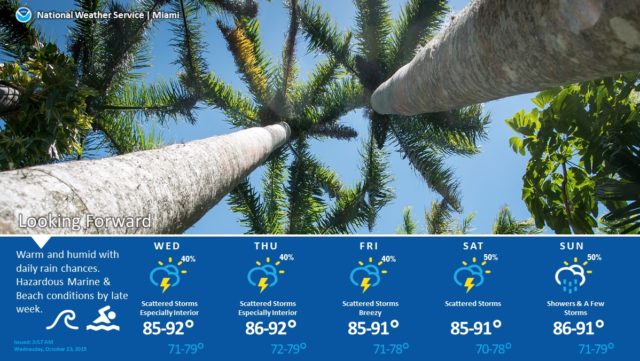 Thursday will bring more showers and storms, breezy conditions in the east coast metro area, and periods of sun. Look for an increasing risk of dangerous rip currents at the Atlantic beaches on Thursday, along with the possibility of minor coastal flooding at high tides. Thursday’s highs will be mostly in the upper 80s.