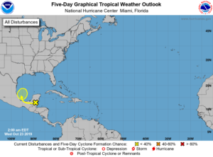 In the tropics, a wave is producing disorganized showers over the Yucatan. The National Hurricane Center gives this feature a low chance of developing into a depression once it reaches the Bay of Campeche.