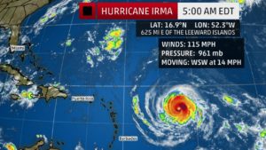 South Florida will be hot and mostly storm-free on Labor Day, but our big concern is the future track of Hurricane Irma. At 5 am Monday, Irma was located near 16.9 North, 52.3 West, and was moving west-southwest at 14 miles per hour. Maximum sustained winds were 115 miles per hour, but Irma is expected to strengthen (and may already have done so, based on satellite images from early Monday).