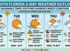 Tuesday will feature a strong and gusty breeze, lots of sun, and the chance of a few showers and storms during the mid to late afternoon. Look for an increasing risk of dangerous rip currents at the Atlantic beaches. Tuesday’s highs will be in the mid-80s.