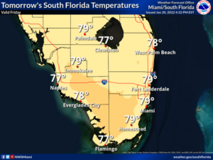 Sunday morning will be cool with a few leftover showers. The day will be breezy with a mix of sun and clouds. Sunday’s highs will be in the mid-70s in the east coast metro area and near 70 degrees along the Gulf coast.