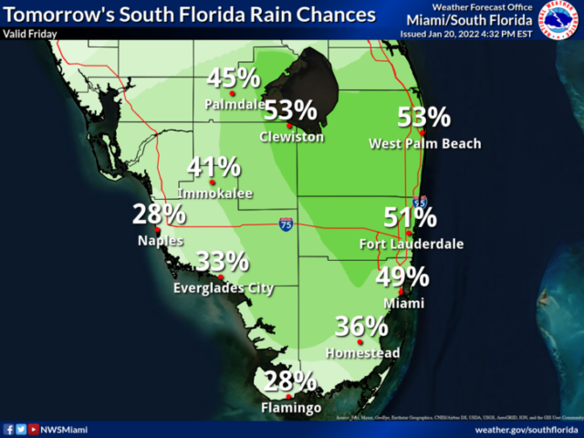 Friday features clouds and periods of storms and showers as a front approaches South Florida. Some storms could be severe, with flooding rain, dangerous lightning, damaging winds, and the chance of small hail. A moderate risk of dangerous rip currents remains at the Atlantic beaches on Friday and into the weekend. Highs on Friday will be mostly in the upper 70s, but some locations could top out at 80 degrees.